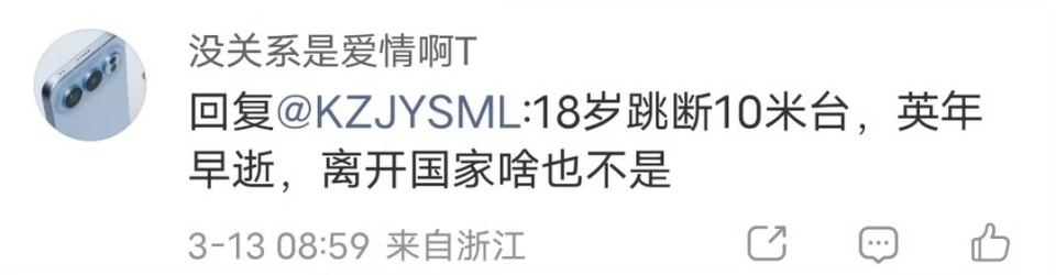 然而,有一名网友多次留言,对全红婵进行恶意攻击、诅咒和造谣,“18岁跳断10米台,英年早逝,离开国家啥也不是”,“谁都知道巴黎单人决赛前一天指使粉丝发恐吓信息拿假金牌,不干净不得人心,被国家开除了”,等等,总之用词非常恶毒。