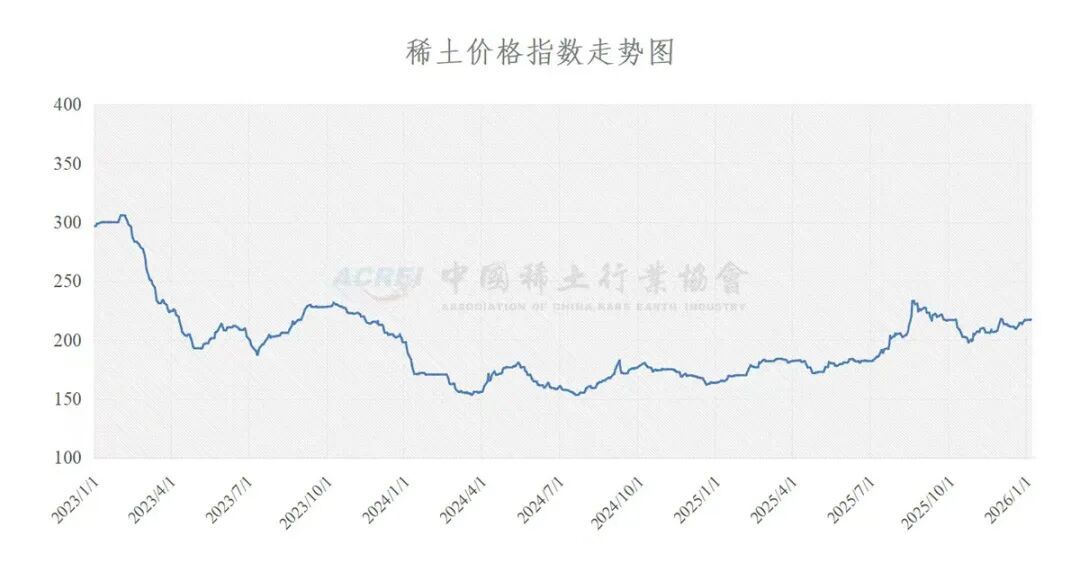 今日价格指数:217.3指数计算:稀土价格指数是由基期和报告期的交易数据计算组成,基期选用2010年全年的交易数据,报告期选用全国20多家稀土企业每天实时交易数据的平均值,代入稀土指数价格模型计算得出。(基期指数为100)